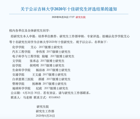 永利官网2020届法学理论专业博士研究生侯明明同学荣获“吉林大学2020年十佳研究生”荣誉称号!