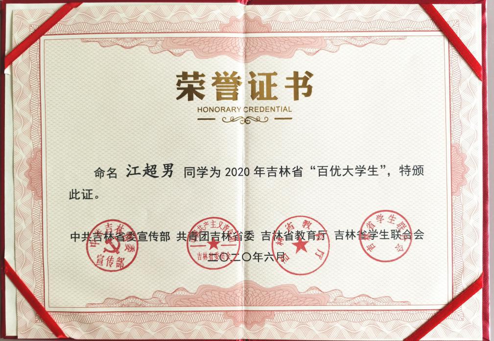 近日,中共吉林省委宣传部、共青团吉林省委、吉林省教育厅、吉林省学生联合会四部门联合下发《关于命名2020年吉林省“十佳百优大学生”的决定》,我院2020届本科生江超男被评为2020年吉林省“百优大学生”,2020届本科生董思雨被评为2020年吉林省“优秀大学生(抗疫专项)”。