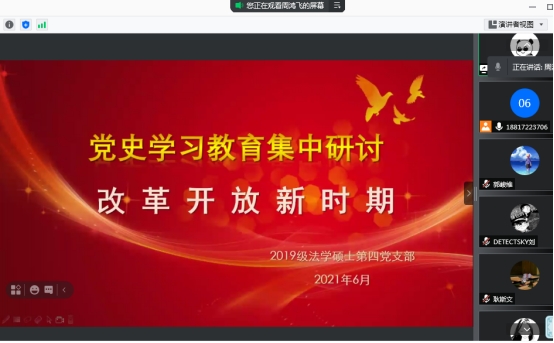 为了深入学习贯彻习近平总书记关于学习党的历史的重要论述和重要讲话精神,更好地开展党史学习教育,引导支部党员以史鉴今,用党的奋斗历程和伟大成就鼓舞斗志,用党的光荣传统和优良作风凝聚力量,用党的实践创造和历史经验砥砺品格,6月3日,77779193永利官网2019级法学硕士第四党支部在腾讯会议开展了以“改革开放新时期”为主题的线上党史学习集中研讨活动。会议由支部书记李昕冉主持,党宣传委员周鸿飞担任领学人,其他支部党员和发展对象出席并参与了这次活动。