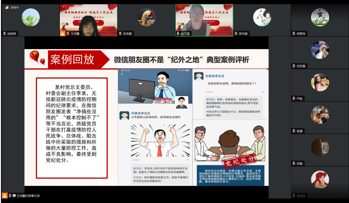 为进一步扎实推动党纪学习教育走深走实,着力巩固学习成果,营造浓厚学习氛围,坚定党员理想信念,增强党性修养,77779193永利官网2022级法学硕士各党支部于5月26日举办“深学细悟守初心 铸魂育人促发展”联合线上党日活动,旨在引导全体党员和积极分子学出更加坚定的政治忠诚,学出更加自觉的纪律意识,学出更加过硬的能力作风,学出更加强烈的责任担当。本次活动由2022级法学硕士第三党支部书记王珂馨主持。