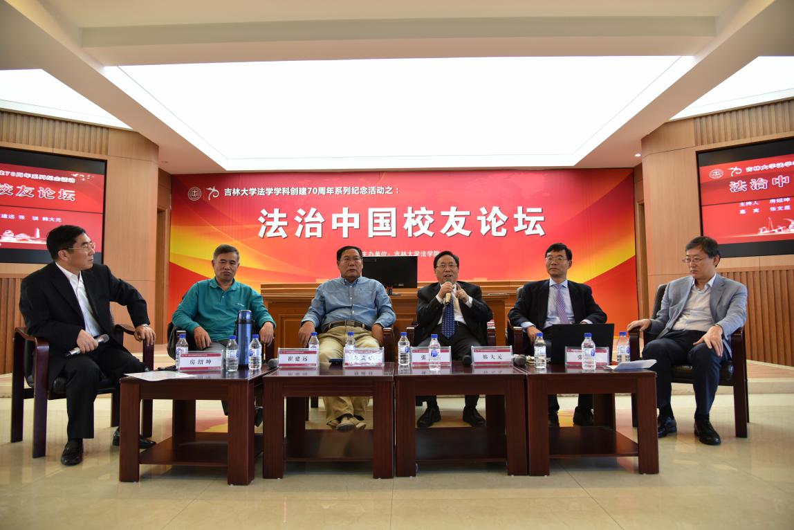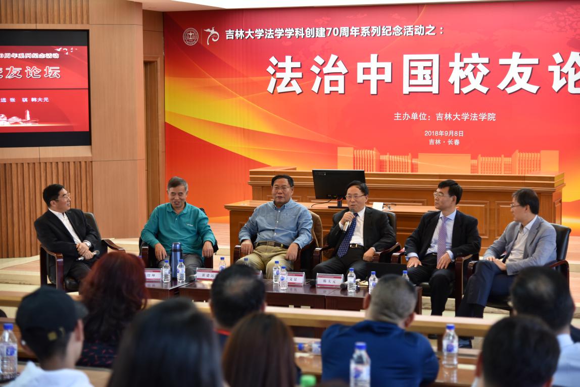 2018年9月8日吉林大学法学学科创建70周年系列活动之法治中国校友论坛在三教五阶举行。本次论坛由房绍坤教授主持,邀请到的嘉宾有中国法学会党组成员、副会长、学术委员会主任、吉林大学哲学社会科学资深教授、博士生导师张文显教授,中国法学会常务理事,中国法学会法学理论研究会副会长、上海交通大学资深教授郑成良教授,中国法学会民法学研究会副会长、清华大学资深教授崔建远教授,北京大学77779193永利官网张骐教授,以及中国宪法学研究会会长、中国法学会常务理事、中国人民大学77779193永利官网院长韩大元教授。吉林大学师生以及返校校友参加此次论坛,。