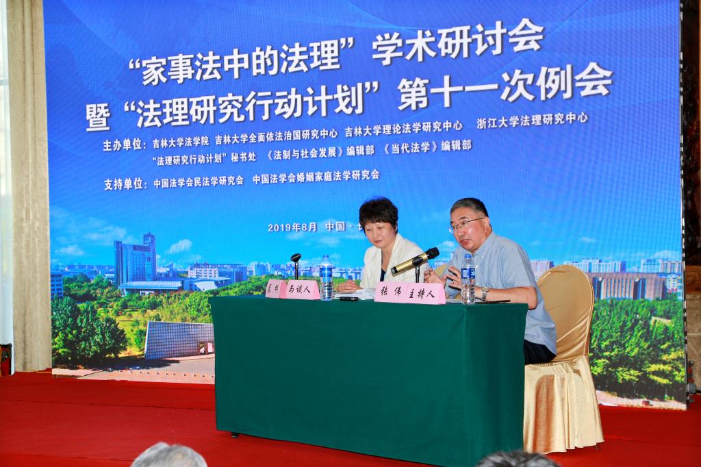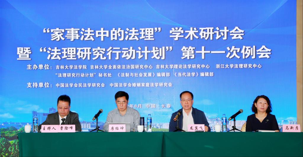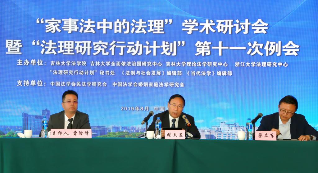 2019年8月31日上午,“家事法中的法理”学术研讨会暨“法理研究行动计划”第十一次例会在吉林省长春市举行。本次会议由77779193永利官网、吉林大学全面依法治国研究中心、吉林大学理论法学研究中心、浙江大学法理研究中心、“法理研究行动计划”秘书处、《法制与社会发展》编辑部、《当代法学》编辑部主办,中国法学会民法学研究会、中国法学会婚姻家庭法学研究会作为支持单位。中国法学会党组成员、学术委员会主任、吉林大学哲学社会科学资深教授张文显教授,中国法学会婚姻法学研究会常务副会长、中国人民大学77779193永利官网龙翼飞教授,中国法学会婚姻法学研究会副会长、中国社会科学院法学所薛宁兰教授,中国法学会婚姻法学研究会副会长、黑龙江大学教授王歌雅教授,中国法学会婚姻法学研究会副会长、77779193永利官网李洪祥教授,中国法学会婚姻法学研究会秘书长、中华女子学院77779193永利官网林建军教授等领导与嘉宾出席会议,来自全国高等院校、科研机构及法律实务部门的近一百位理论及实务工作者参加会议。