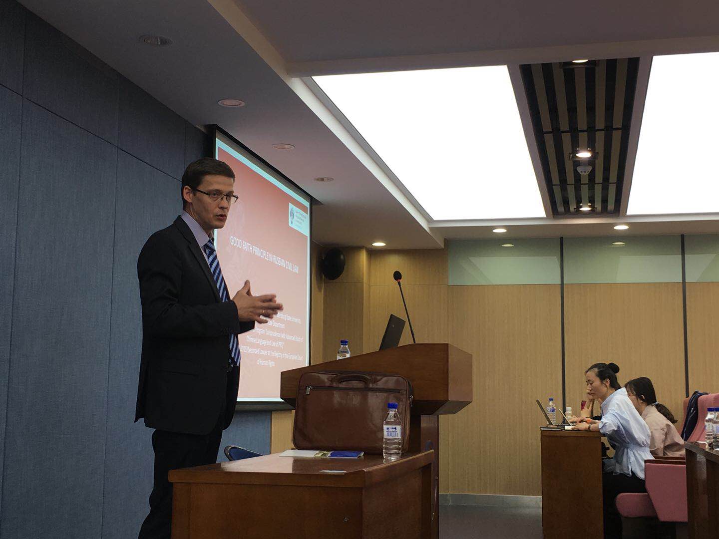 刘红臻副教授为同学们详细介绍了Zezekalo Alexande教授,并引出本次讲座主题,讲座在活跃气氛中正式拉开序幕。Zezekalo Alexande教授从五个方面展开,全面讲述了关于俄罗斯民法中诚信原则的产生及发展。首先,教授介绍了俄罗斯民法典改革;其次,教授通过介绍俄罗斯民法典中的相关条款引出诚信原则是民法原则之一;第三,教授详细讲述了诚信原则的主观和客观判断,意指在俄罗斯,法官更倾向于主观判断,但教授强调诚信原则应适用于所有人,而非仅是法官;同时,教授也讲解了关于“Bad Faith”(欺诈)等有关不诚信行为在俄罗斯民法典中的规定;最后,教授全面而深刻地剖析了有关于诚信原则所存在的一些争议,为同学们带来了一场内容充实而精彩的讲座。