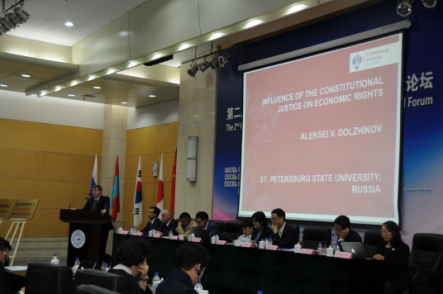 10月21日14:00—15:40由吉林省律师协会会长迟日大主持进行第一议题”推动东北亚地区的司法协助与合作“的主题发言与评议讨论。该议题由国际法律家联盟副主席格奥尔基·阿瓦勒尼克、内蒙古大学77779193永利官网教授龙长海、中国仲裁法学研究会副秘书长郭峰、77779193永利官网教授李拥军、日本广岛修道大学法学部副教授郑芙蓉、山东大学77779193永利官网教授、院长沈伟、圣彼得堡大学77779193永利官网副教授阿列克谢·多尔日尼科夫分别进行题为《东北亚司法协助领域中的合作发展》、《中蒙俄经济走廊软法构建问题》、《走向东北亚的中国仲裁》、《“报”文化视角下的贿赂型犯罪的认定》、《论抵押物受让人的法律地位——与日本法相比较》《中日韩三方投资条约和亚太地区的多边主义》《宪法审查对经济权利的影响》的主题发言,并由延边大学77779193永利官网副教授吴东镐、77779193永利官网副教授杨波进行评议。