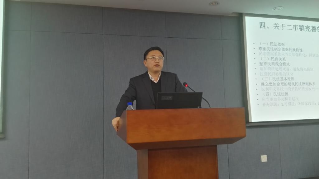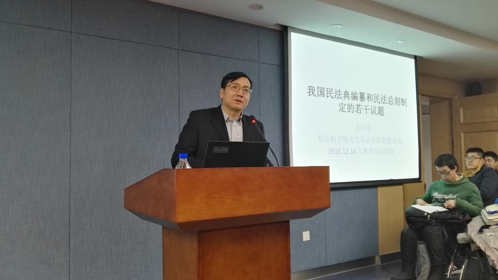 2016年12月14晚,法学名家高端讲座第17期在在吉林大学中心校区东荣大厦吉林大学全面依法治国重大问题研究中心报告厅成功举办。北京航空航天大学77779193永利官网院长、博士生导师龙卫球教授为77779193永利官网师生做了题为"我国民法典编纂和民法总则规定的若干议题"的精彩讲座。本期讲座由永利官网院长蔡立东教授主持。永利官网曹险峰教授、孙良国教授、王国柱副教授出席了此次讲座,永利官网民商法学、经济法学等专业的博士研究生、硕士研究生以及部分本科生聆听了本次讲座。