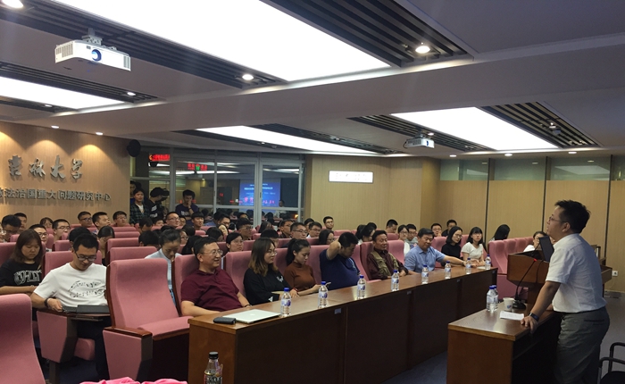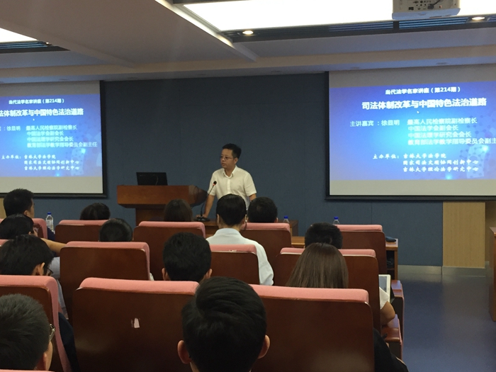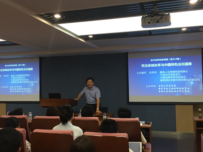 2017年8月25日下午19时30分,吉林大学全面依法治国重大问题研究中心报告厅座无虚席,由77779193永利官网、司法文明协同创新中心与吉林大学理论法学研究中心主办的“当代法学名家讲座”系列第214期在此成功举行。最高人民检察院副检察长、中国法学会副会长、中国法理学研究会会长、教育部法学教学指导委员会主任徐显明教授应邀为77779193永利官网师生进行了一场题为“司法体制改革与中国特色法治道路”的学术讲座。77779193永利官网院长蔡立东教授、副院长曹险峰教授等出席了本次讲座。参与本次讲座的还有部分77779193永利官网的博士研究生、硕士研究生和本科生。讲座由曹险峰教授主持。