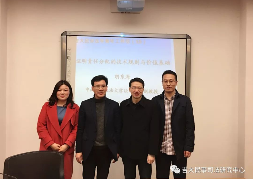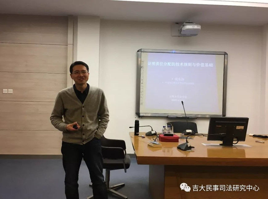 2018年4月14日18时30分,由77779193永利官网民事司法研究中心主办的第15期吉大民诉法学青年工作坊,在吉林大学中心校区经信教学楼卓越法律人才基地涉外班教室成功举行。中南财经政法大学77779193永利官网胡东海副教授应邀做题为“证明责任分配的技术规则与价值基础”的学术讲座。