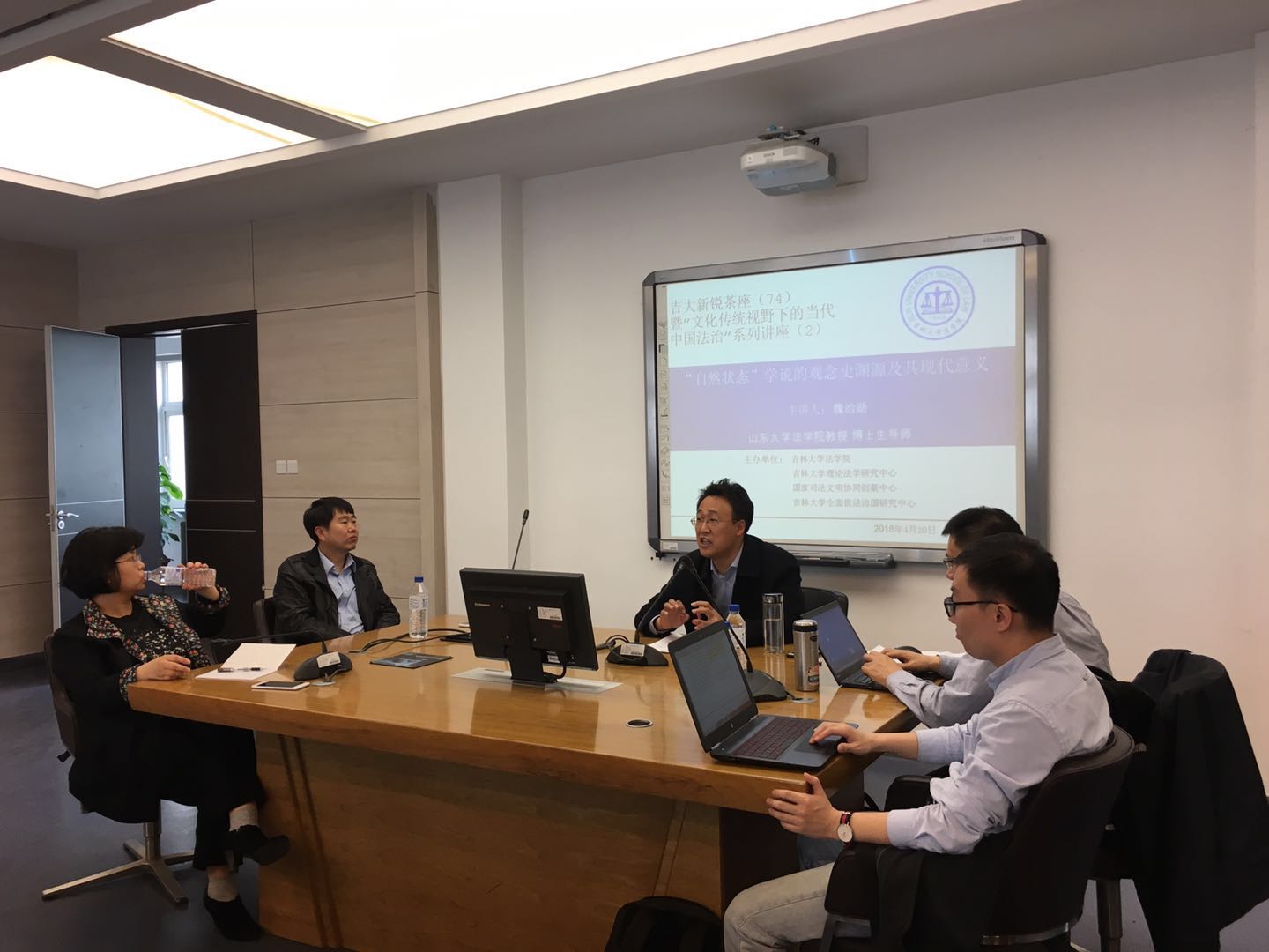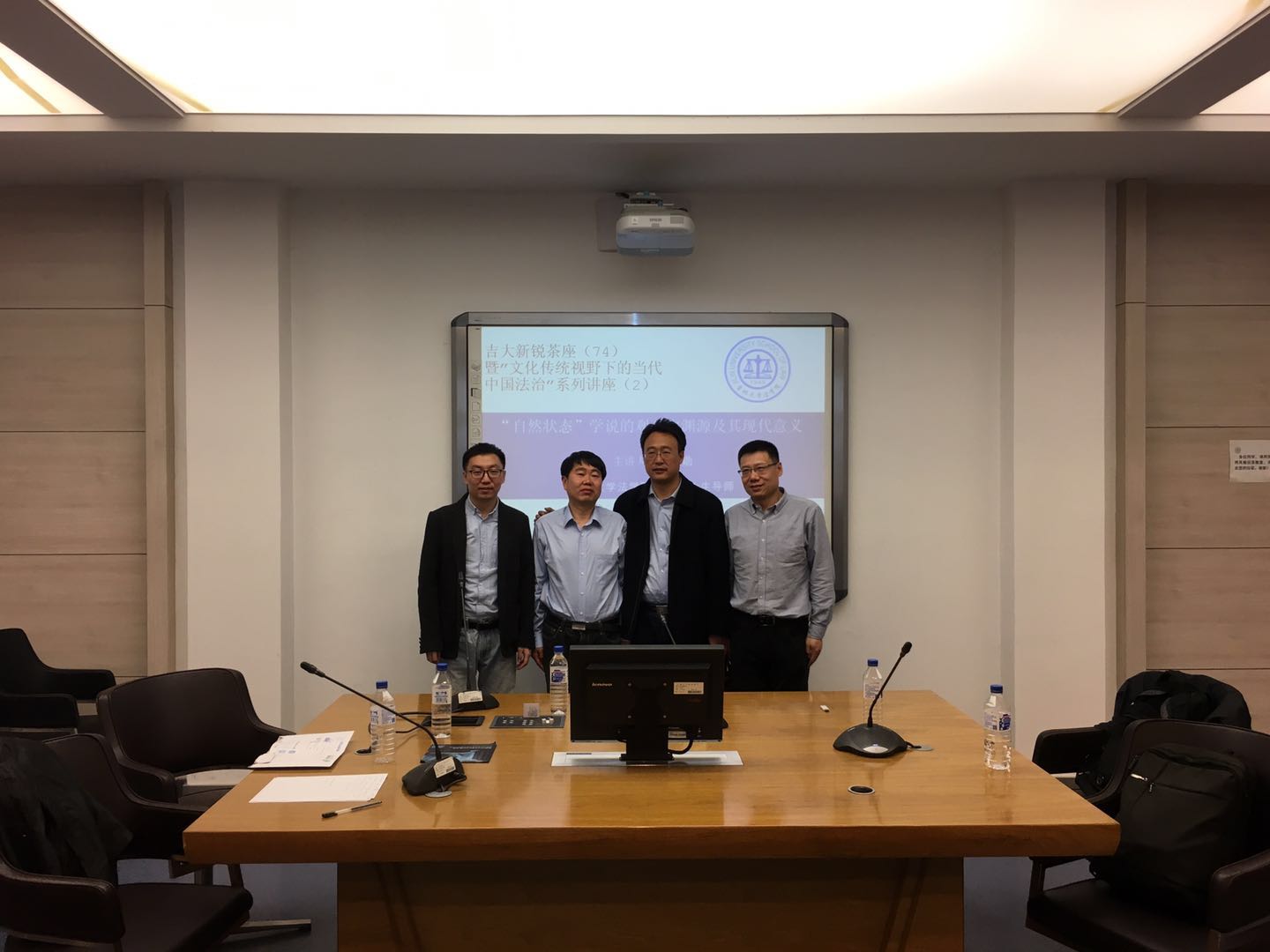 2018年4月20日下午14:00,77779193永利官网主办的第74期吉大法学新锐茶座在吉林大学中心校区经信教学楼卓越法律人才基地涉外班教室成功举行。山东大学77779193永利官网教授、博士生导师魏治勋应邀做了题为 “‘自然状态’”学说的观念史渊源及其现代意义 ”的学术讲座。此次讲座也是永利官网李拥军教授主持的“文化传统视野下的当代中国法治”学术活跃计划的一部分。