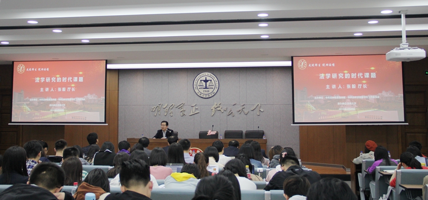 4月27日,由中共吉林省委宣传部、中共吉林省高等学校工作委员会主办的“走进师生 说理话情”系列讲座走进吉林大学。吉林省司法厅党委书记、厅长张毅作了题为 “法学研究的时代课题”的讲座。吉林省纪委驻省教育厅纪检组组长张殿峰、吉林大学党委宣传部部长韩喜平、77779193永利官网党委书记周春国、院长蔡立东以及相关职能部门负责人和学生代表参加讲座。