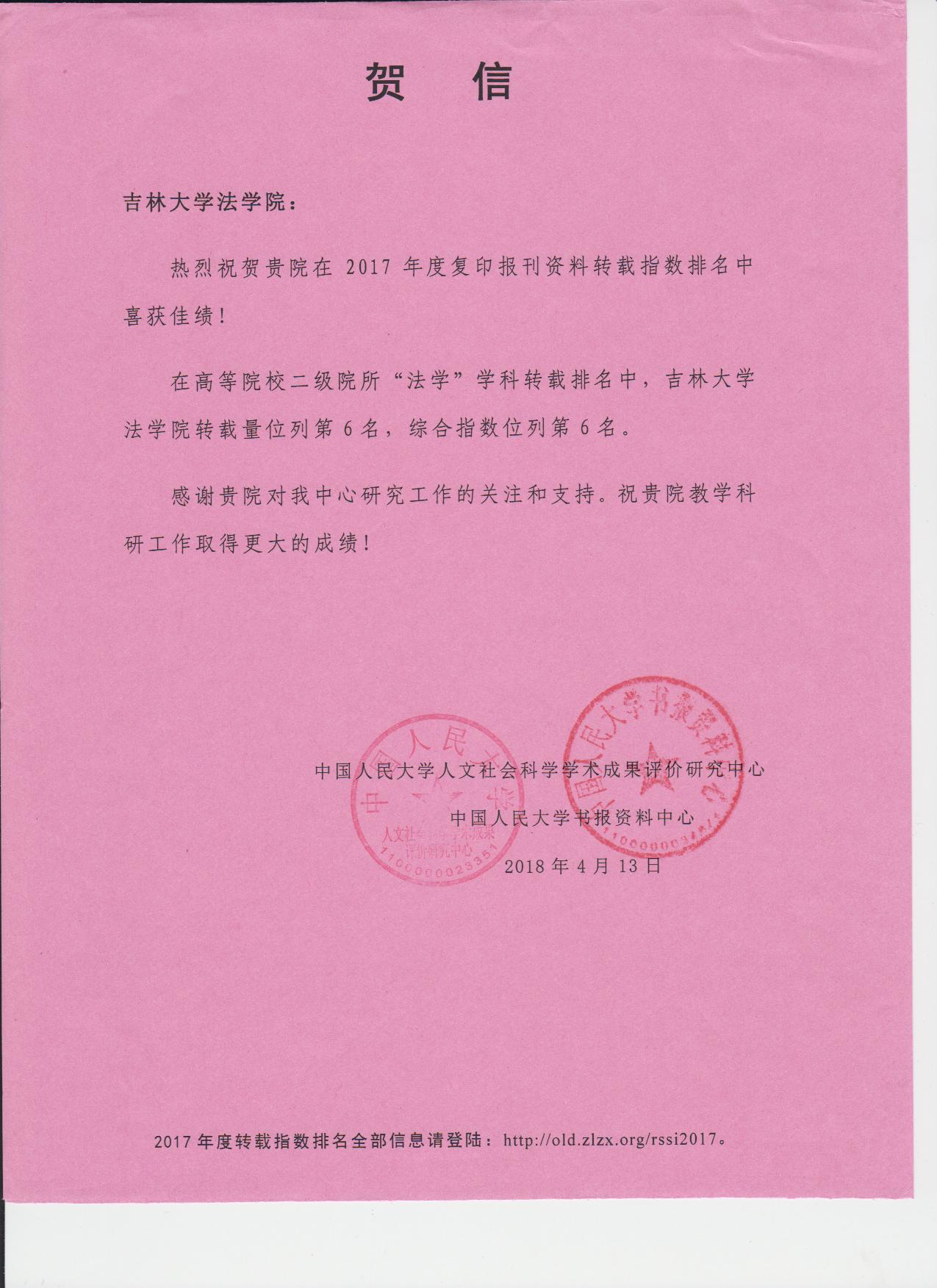 近日,中国人民大学社会科学学术成果评价研究中心、中国人民大学书报资料中心给永利官网发来贺信,祝贺永利官网在2017年度复印报刊资料转载指数排名中喜获佳绩!在高等院校二级院所“法学”学科转载排名中,77779193永利官网转载量位列第6名,综合指数位列第6名。