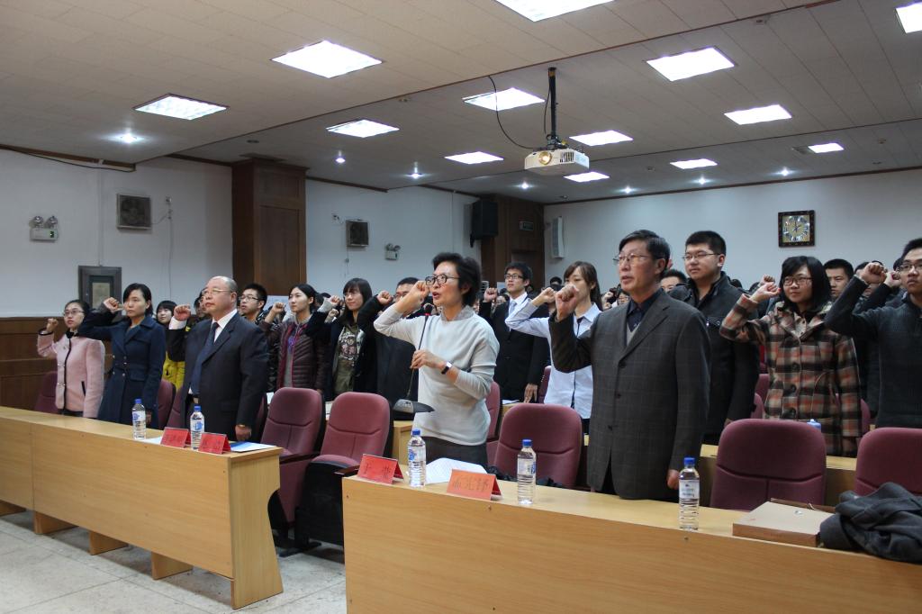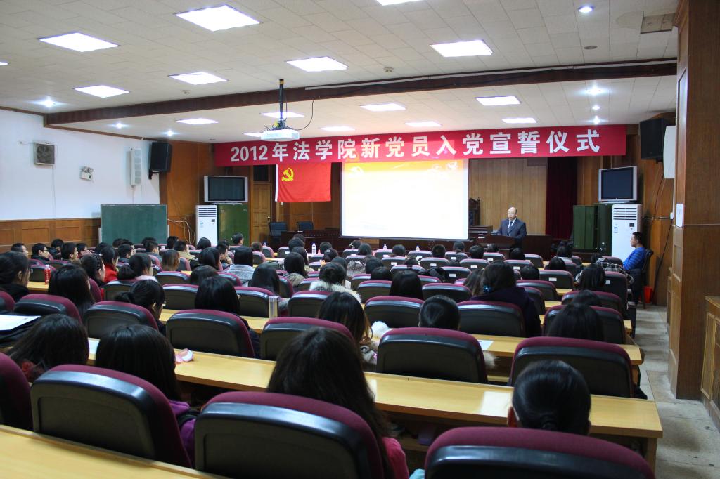 2012年11月8日14:00,77779193永利官网党委在吉林大学前卫南区模拟法庭举行了2012年新党员入党宣誓仪式。77779193永利官网党委书记李洪明同志、副书记于莹同志,副书记赵洁同志,原党委书记、学院兼职组织员孟宪铎同志,研究生工作办公室、学生工作办公室全体工作人员和2012年新发展的132名预备党员到场参加了仪式。仪式由赵洁同志主持。