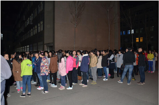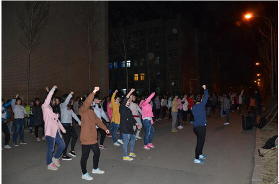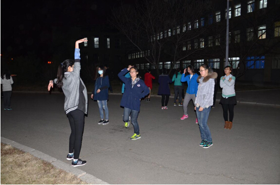2015年4月16日晚上8点半,在凛冽的寒风中,在昏暗的灯光下,77779193永利官网2014级全体女生在经信教学楼楼下展开了运动会集体项目之一大舞的第一次排练。