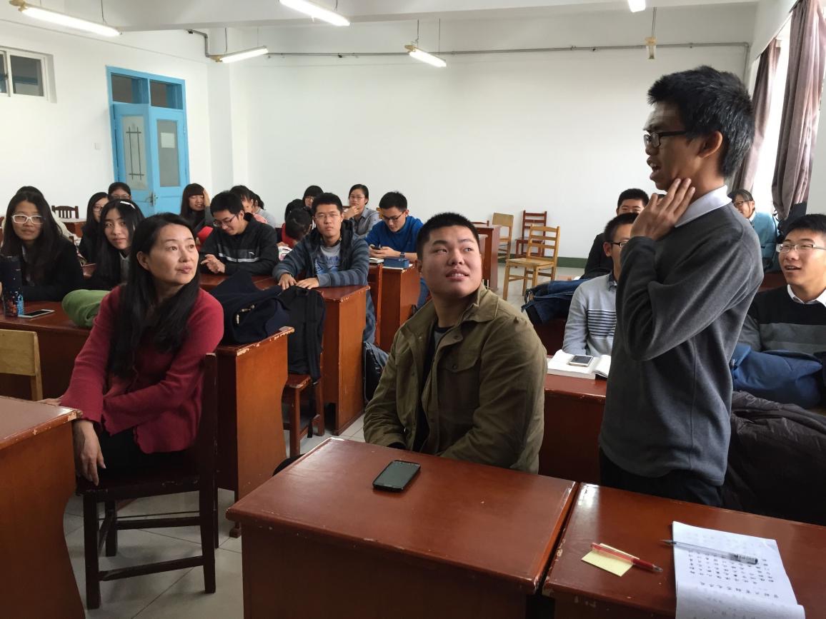 最后,王弘宁老师提议每个寝室的寝室长站起来说几句,内容可以是有关自己寝室的人和事,也可以是向老师提出问题或是需要老师帮忙解决的困难。有的寝室长表示自己的寝室很有爱,有的以自己的视角分别介绍了一下自己寝室的成员,有的则向老师发问:冬天自行车放在哪里啊?中间更是穿插了一段“歌王”献歌的环节,现场掌声雷动,气氛热烈。