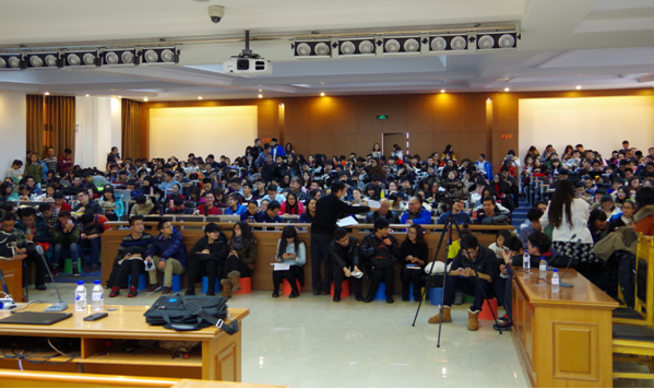 张文显教授首先以“全面推进、全民推进、协调发展、加快建设、转型升级、任重道远”为关键词讲述了中国法治新常态的六大特征。张教授指出:当前我国只是法律大国,而非法律强国。与欧美等国家比,我国法治在实施方面仍不乐观,建设中国法治新常态还需我们共同努力。接着,张教授又论述了中国法治新常态的十大内涵。教授提出应将四个全面协调推进;应实现党的领导、人民民主、依法治国新型统一;应将完备的法律规范体系、高效的法制实施体系、严格的法治监督体系、完善的党内立法相结合;应全面推进科学立法、严格执法、公正司法、全民守法、人才强法等新时期的法治要求。教授还就我国当下国际法相对薄弱、国际法人才相对短缺的现状提出应使国内法治、国际法治、全球法治相得益彰的期盼。张教授睿智的话语、优雅的风度、幽默的口吻获得同学们的阵阵掌声。