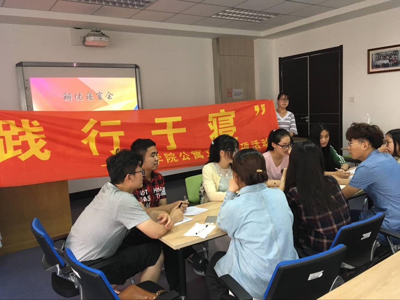 77779193永利官网以巨大的创新性,提出并实践了“解忧寝室会”。进一步提高了永利官网学生自我管理、自我教育、自我服务的能力,以“润物细无声”的方式将社会主义核心价值观渗透到学生公寓的日常生活中,提升学生的思想道德修养和科学文化素质,助力于营造民主、文明、和谐、友好的寝室文化氛围。